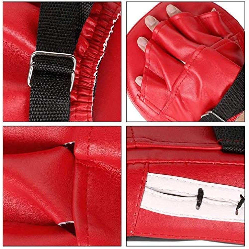 The curve on the focus mitts help you place the pads perfectly onto your hands giving the best grip to the training instructor. On the reverse of the pad there is an elasticized glove which allows an easy on and easy off process. A gentle padding in the glove gives a perfect grip to the trainer. The padding in the hook and jab pads contains several layers of high potency foam padding which helps to absorb the kicks and punches. Focus pads enable instructors to work with boxers and martial artists to work on their footwork, balance, co-ordination and power. These focus mitts or hook and jab pads as they are sometimes called are an essential tool for MMA, boxing or traditional martial arts. The curved focus pads are very popular as they sit in a trainers hand in a comfortable and natural position which allows the pads to absorb punches and the instructor can catch punches better. Specification: Material : Flexible sponge and PU leather Purpose: Boxing, Taekwondo, MuayThai Kick Durable, portable and compact.